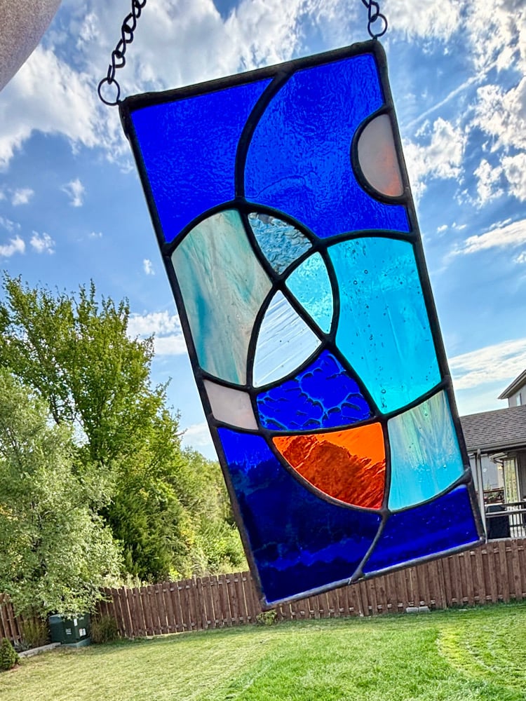 This handmade abstract stained-glass panel features deep cobalt blues, aqua tones, textured clear glass, and a bold orange accent. With its modern geometric flow, it catches sunlight beautifully and adds a vibrant, artful touch to any window or space making it a stunning focal point. Perfect for modern decor, coastal interiors, and stained-glass collectors.