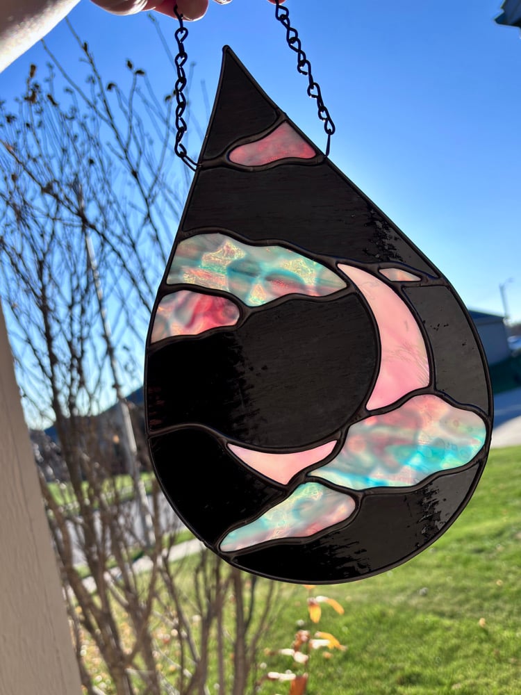 A dreamy opal Moon rises through swirling pastel clouds in this handcrafted stained-glass teardrop panel. The glossy black night sky created a bold contrast, making the opalescent mottled glass glow beautifully in the sunlight--This piece gives ethereal, otherworldly vibes for days! It's perfect for spiritual spaces, altars, nurseries, meditation rooms, or anyone who loves magical celestial art.