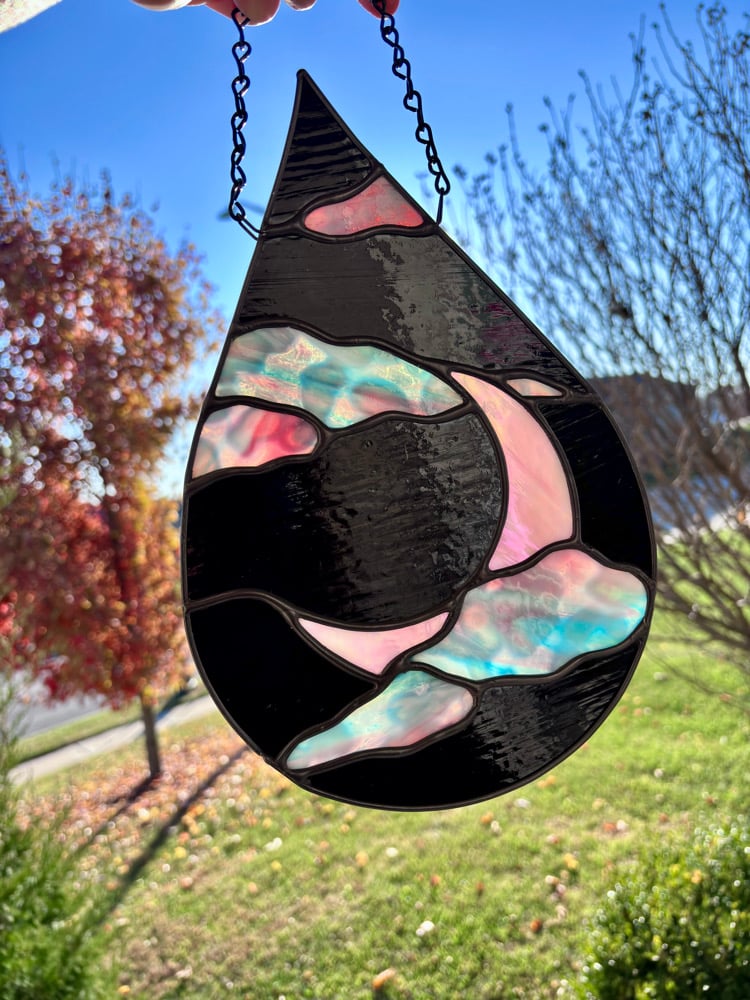 Celestial Stained-Glass Moon & Cloud Teardrop Panel - Opal Pink & Black Celestial Window Hanging