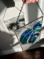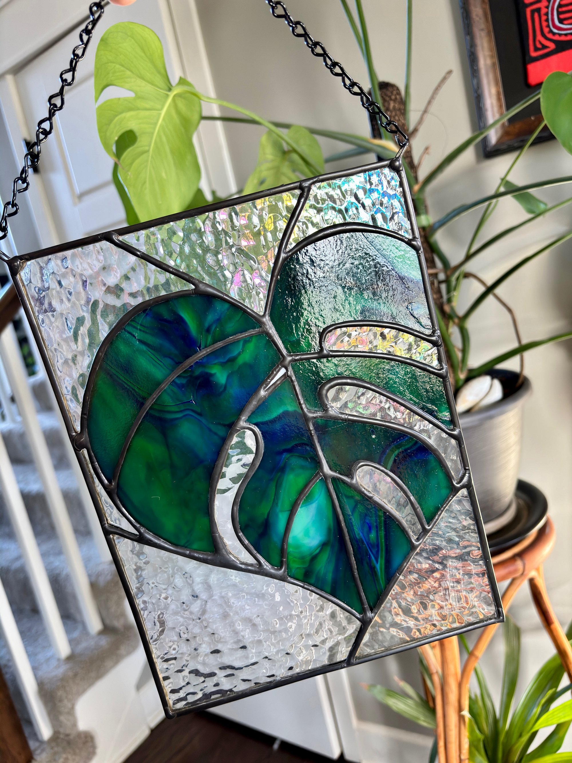 Bold greens and deep blue swirls form a vibrant Monstera leaf framed in shimmering textured clear glass. This botanical stained-glass piece brings fresh, tropical energy into any window and makes a stunning gift for plant enthusiasts, as botanical decor, kitchen or sunrooms, and perfect for bright airy spaces.