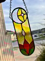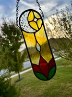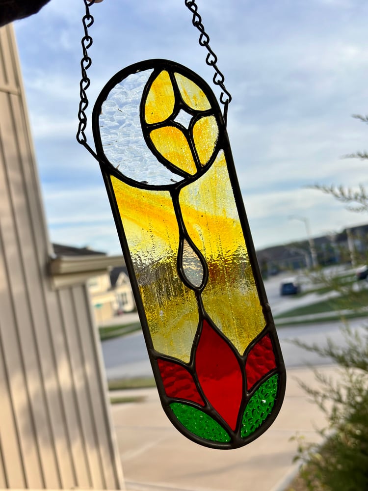 This handmade stained-glass suncatcher features a glowing moon cradling a star above a vibrant red flower and green leaves. Crafted with textured and smooth glass in warm golden tones, it catches sunlight beautifully and brings a gentle celestial glow to any window or space. A beautiful accent for sacred spaces, reading nooks or anyone who loves lunar symbolism and handmade art lovers.