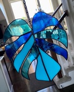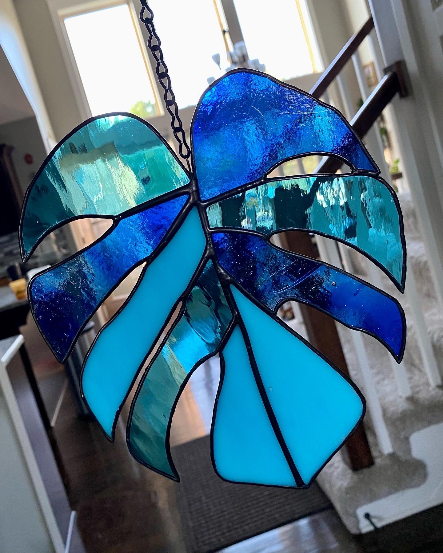 Single Large Monstera Leaf featuring various colored glass in greens, yellows or custom colors per customer pick (please use the drop down to select the color choices). The piece will have a patina applied and will include a large suction cup (holds up to 7lbs) though it is always recommended to use a hook or mail for safety.
