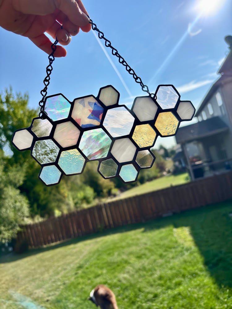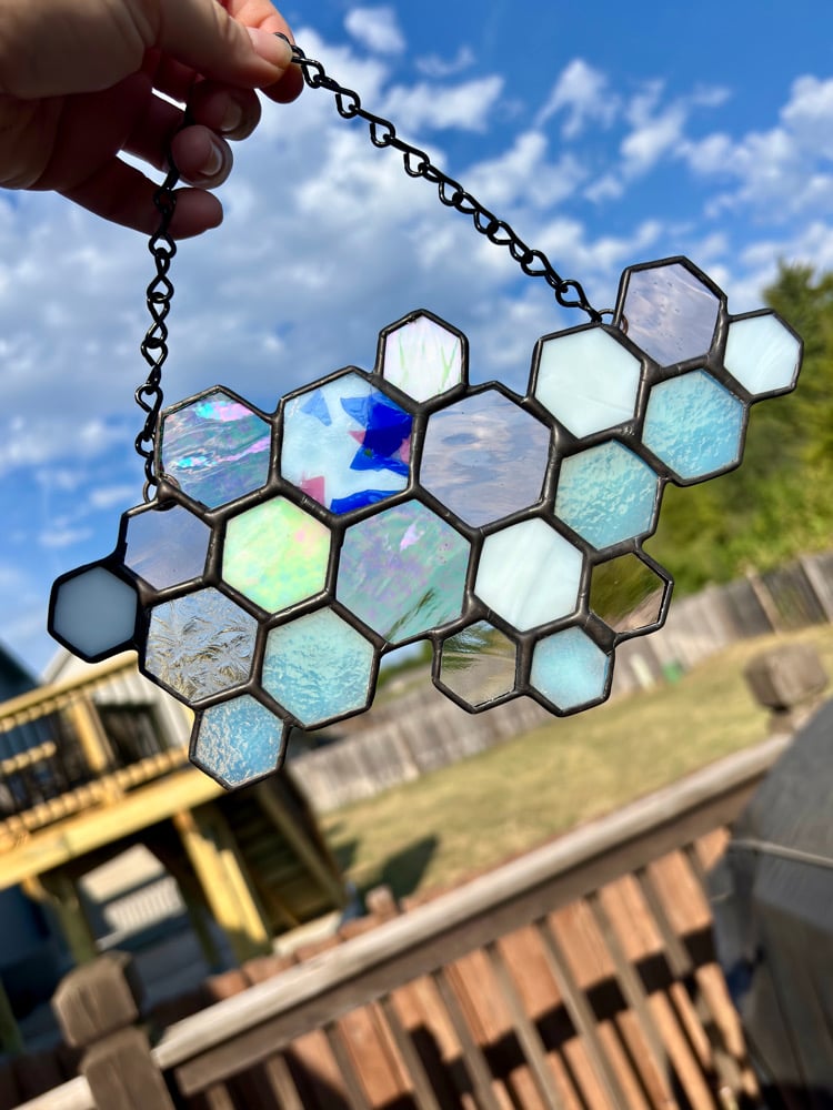 This handmade stained-glass honeycomb cluster captures sunlight with glowing iridescent surfaces, frosted whites, and warm golden tones. The geometric hexagon design creates a modern, airy window piece that shifts seamlessly into nature-inspired, minimalist, or contemporary decor. A perfect gift for bee lovers, plant enthusiasts, stained glass collectors, and handmade art lovers.