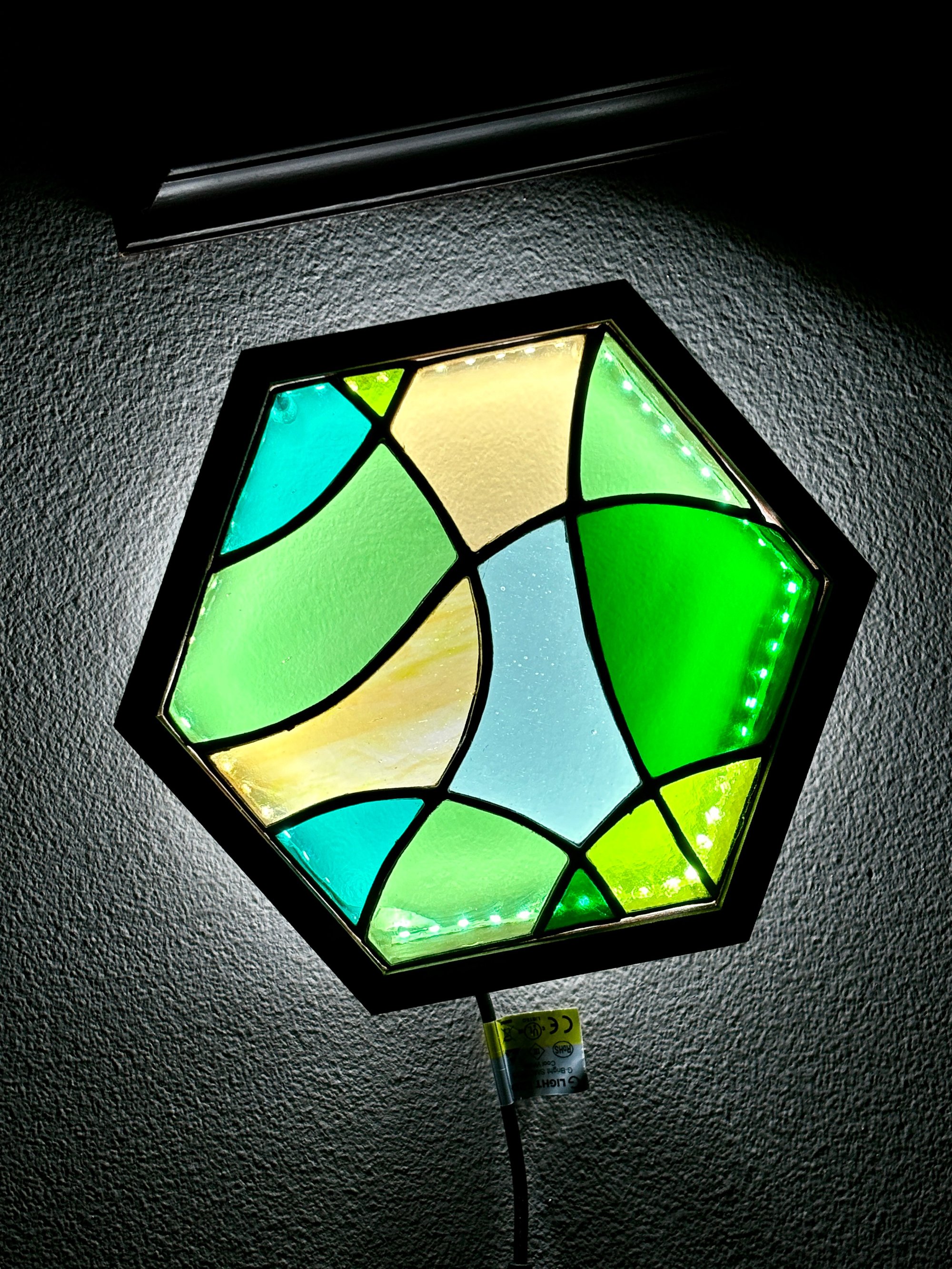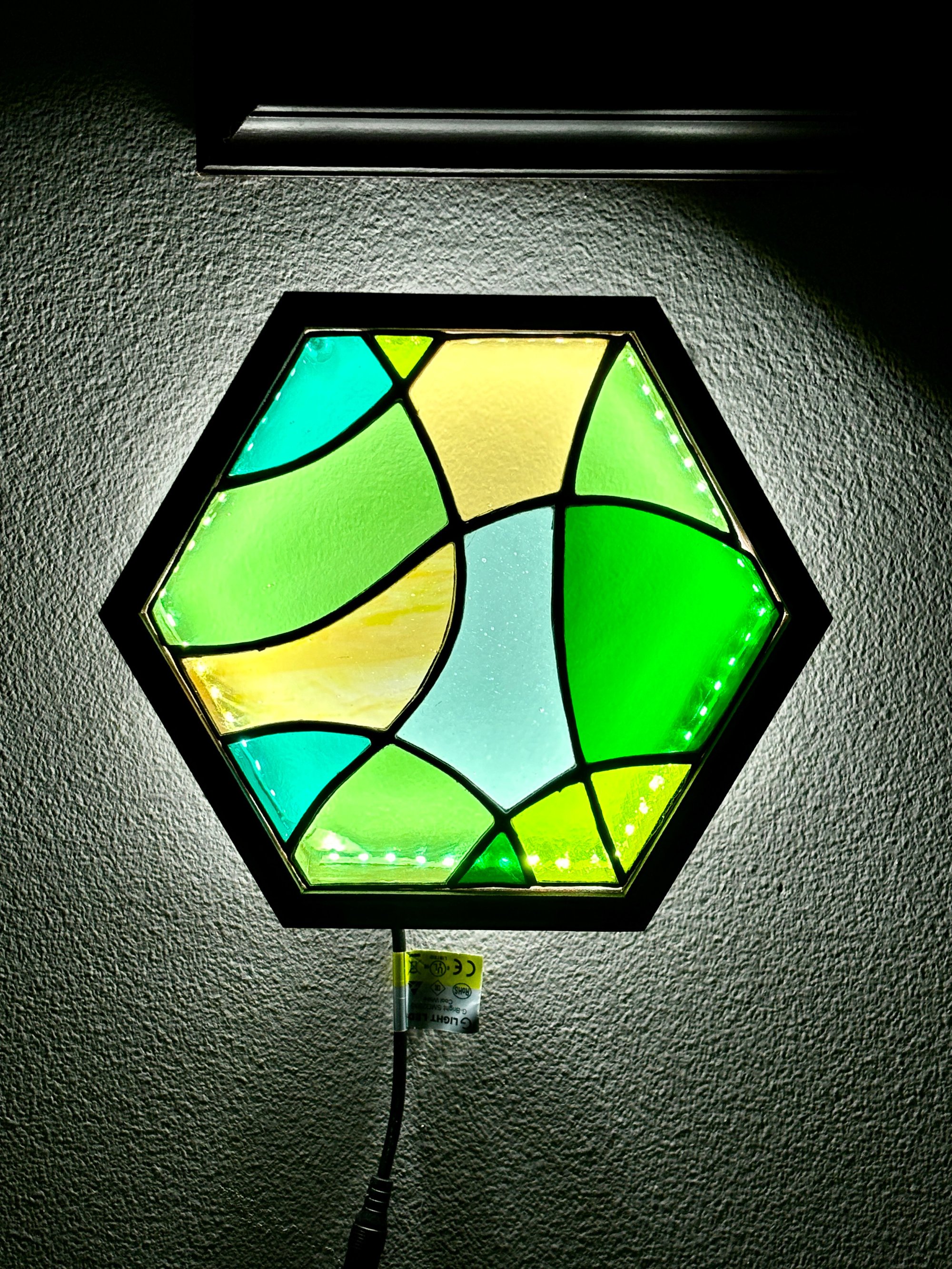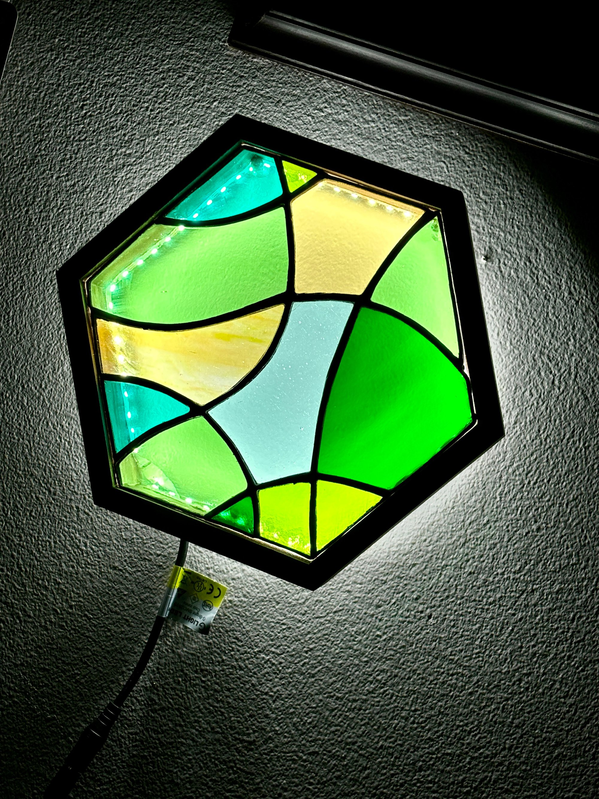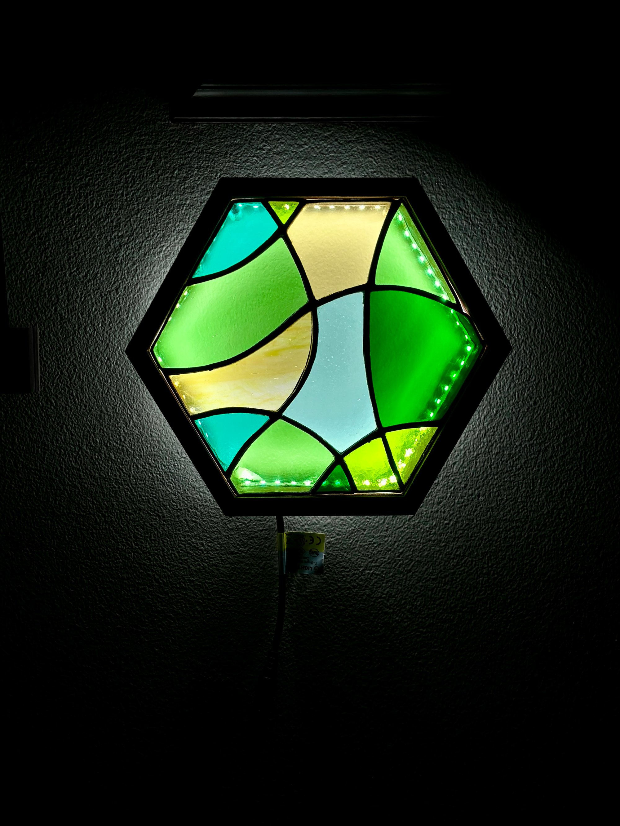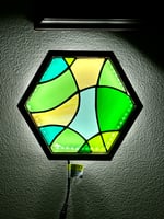 A modern twist on stained glass - this handmade stained glass LED hexagonal lightbox features a geometric design with glowing shades of green, aqua, and warm yellow. The hexagon frame includes built-in LED backlighting and can be displayed as either a hanging wall piece or a tabletop lightbox, making it a versatile illuminated artwork for any space. Perfect for bedrooms, hallways, meditation rooms, cozy reading corners, mindful spaces, or art studios--it's a functional statement piece!